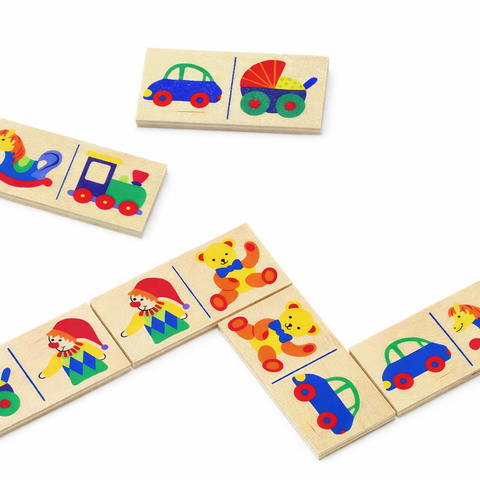 Klasična drvena domino igra s ilustriranim motivima dječjih igračaka i vozila.