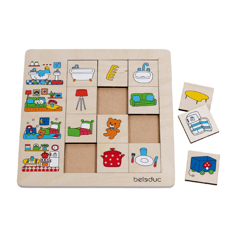 Drvena slagalica je čvrsta i za korištenje, dok tematika svakodnevnih prostora potiče razumijevanje doma, redoslijeda i svakodnevnih aktivnosti kod male djece.