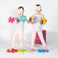 Set sadrži: 4 velike puzzle, 4 male puzzle, 4 taktilna privjeska i povez za oči